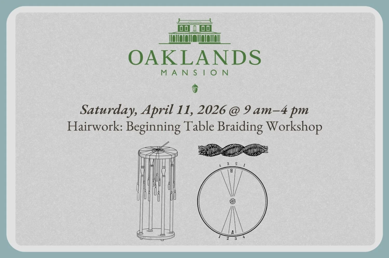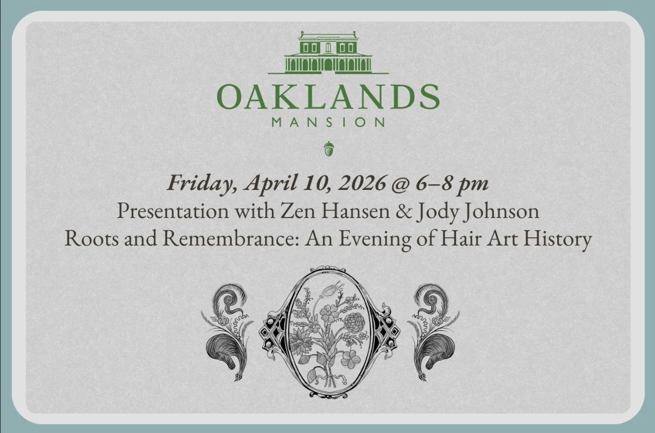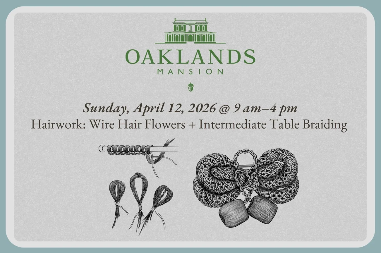 Learn the intricate history of Victorian Hairwork, enjoy a behind-the-ropes tour of Oaklands Mansion, and learn how to make a hair flower using the wire work method. Beginner level and intermediate level classes.