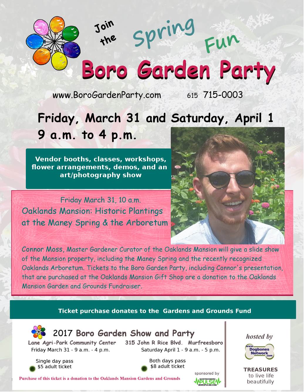 Tickets are on sale now for the Murfreesboro Garden Show & Party on March 31st & April 1st at the Lane Agri-Park. Come see Oaklands Master Gardener, Connor Moss, who will be one of the featured speakers this year!