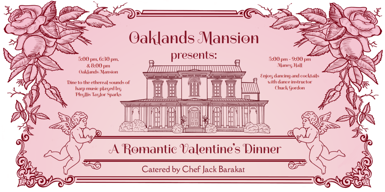 Guests may arrive anytime Saturday, February 14th, starting at 5:00 PM, to enjoy dancing and cocktails in Maney Hall. At your reserved seating time of 5:00 PM, 6:30 PM, or 8:00 PM, you will be greeted at the front door of Oaklands Mansion by the ethereal sounds of harp music played by Phyllis Taylor Sparks. A staff member of Oaklands will guide you to your table, and dinner will be served by professional waitstaff.